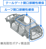 エアウェイブでは前面衝突時の安全性能を高めるために、アーチ型サイドフレームを採用。フレームをなだらかなアーチ状にすることで、衝突時の衝撃を効率よく分散します。また大開口のスカイルーフとテールゲートを支えるために、それぞれの開口部まわりの骨格を閉断面化。充分な強度と剛性を確保しています。