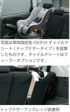 ロアアンカレッジで車両限定型ISOFIXチャイルドシートの取り付けが確実・容易。さらにチャイルドシートをより確実に固定するためのトップテザーアンカレッジを装備し、万一の衝突時、チャイルドシートの前方移動を効果的に抑制します。