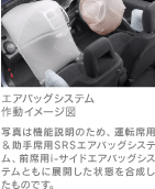 ■運転席用&助手席用SRSエアバッグシステムは、横方向や後方向からの衝撃には作動しません。前方向からの、設定値以上の衝撃を感知したときのみ作動します。■SRSエアバッグシステムは、あくまでもシートベルトを着用することを前提として開発されたシステムです。くれぐれもシートベルトの正しい着用をお願いします。