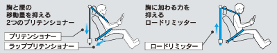 前方向からの強い衝撃を感知すると瞬時にシートベルトを巻き取り、その後、一定以上の荷重がかかるとシートベルトを少し送り出し、胸などへの負担を軽減します。また、ショルダー側のプリテンショナーに加え、腰ベルト外側にラッププリテンショナーを採用。乗員の拘束効果をいっそう高めることにより、傷害の軽減をめざしました。