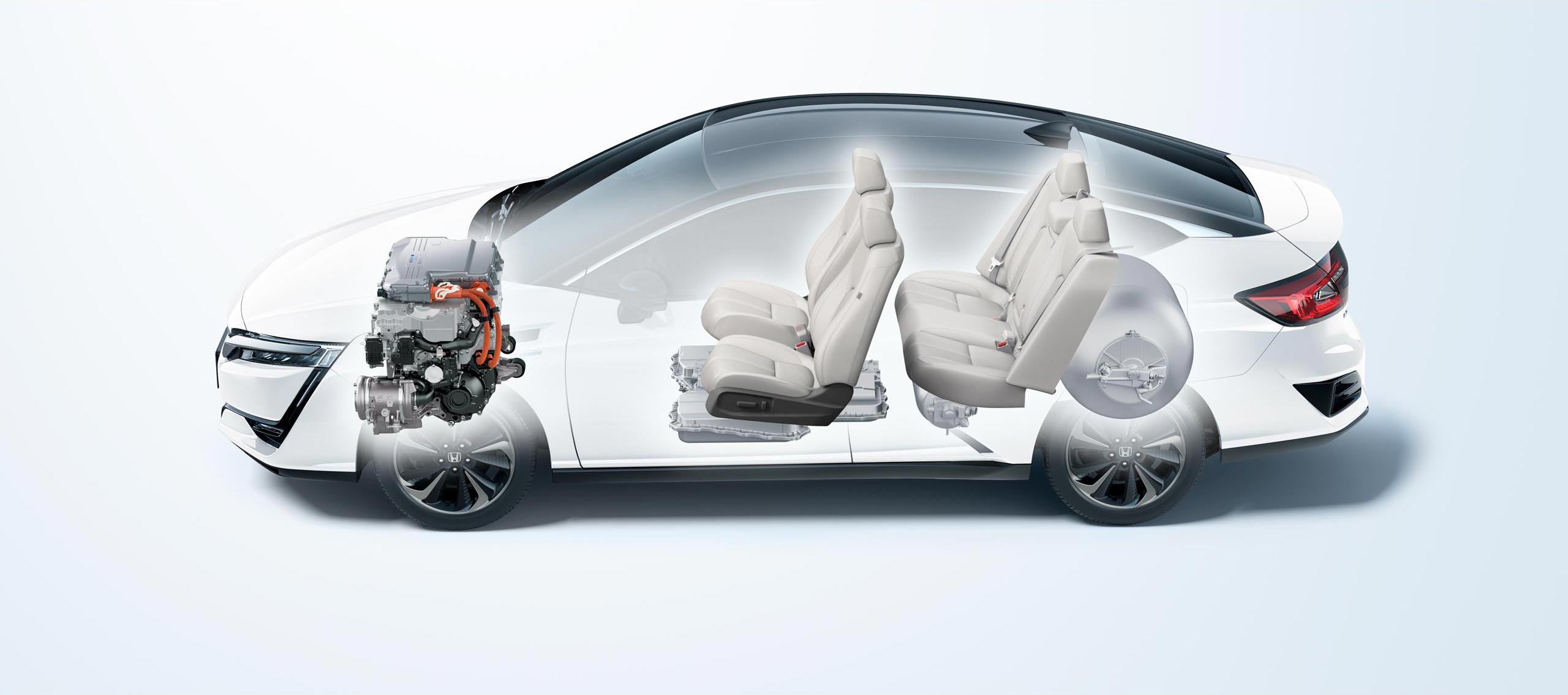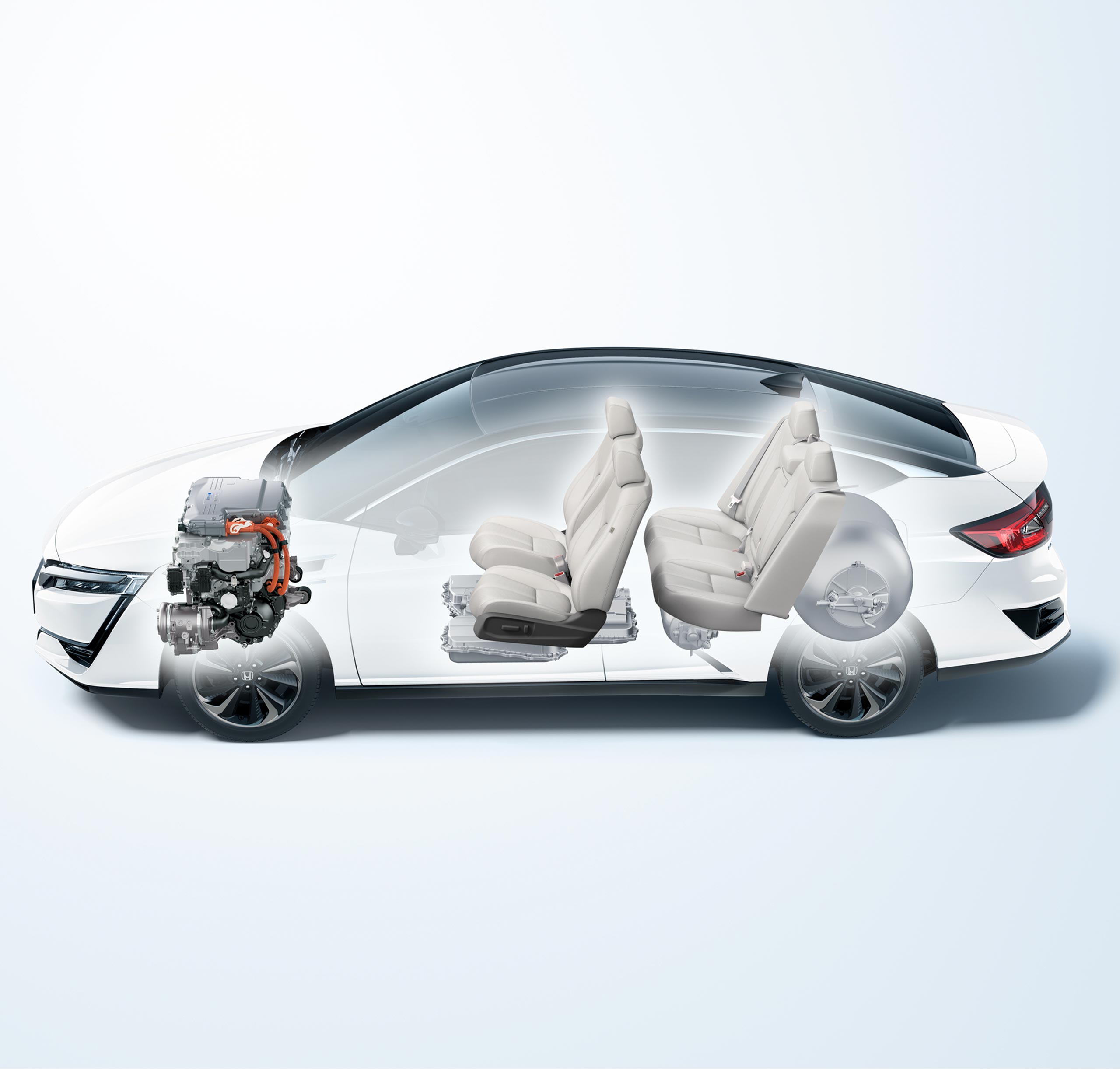 ※4 SAE規格(J2601)の標準条件(外気温20℃、高圧水素タンク内の圧力10MPaからの充填)に基づいた水素充填圧70MPaステーションでの充填作業におけるHonda測定値であり、仕様の異なる水素ステーションで充填した場合は、高圧水素タンク内に充填される水素量が異なるため、走行距離も異なります。また、同条件下で水素充填圧82MPaステーションで充填した場合は、走行距離は約810kmとなります。走行距離は使用環境(気象、渋滞等)や運転方法(急発進、エアコン使用等)に応じて大きく異なります。