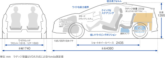 低速域から強力にアシストするIMA(インテグレーテッド・モーター・アシスト)と、1気筒あたり4バルブの1.5L i-VTECエンジンを組み合わせることで、1,000〜1,500回転で最大トルクを発生するとともに高回転域までストレスなく吹き上がる特性を獲得。軽量ボディと合わせ、2.0Lガソリンエンジン車クラスの力強い加速感をもたらします。同時に、22.8km/L*の低燃費を実現し、「平成27年度燃費基準+20%」を達成。「平成17年排出ガス基準75%低減レベル」認定も取得しています。