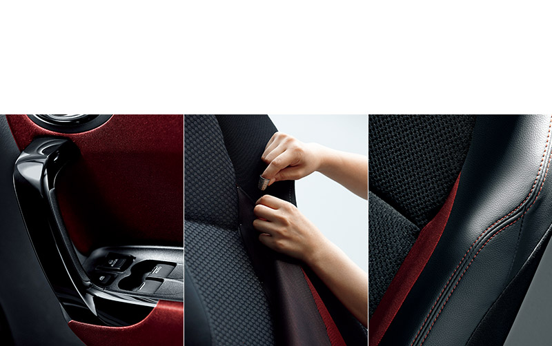 赤い生地は、黒の糸も編み込むことで、眺める角度によって赤の深みが変わる“ゆらぎ”を実現した。