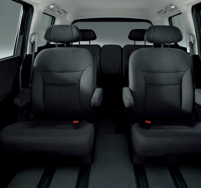 2列目シートを格別なゆとりとくつろぎで満たすキャプテンシートは、それぞれ両側にアームレストを装備した左右独立タイプ。シート間のウォークスルーも可能です。パーソナルな使い勝手を高めるとともにチップアップ&スライド機構も採用し、乗車人数や荷物の量などにあわせたシートアレンジも多彩です。