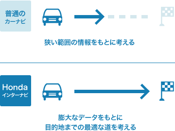 最大の問題は、普通のカーナビが日本中の交通情報が集まる「VICS」データを現在地周辺の分しか受け取れないこと。ならば、目的地までの必要な情報を、Hondaが一つに束ね、クルマに直接届けよう。通信機能を持ったインターナビの誕生。