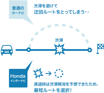 情報が多いからこそ、より正確な判断ができる。何曜日の何時頃、どこが渋滞し、どう変化するか。渋滞のクセまで見抜くインターナビ。「渋滞のあるルートが、結果的に一番早い」と予測すれば、あえて渋滞のある道を選択することもある。