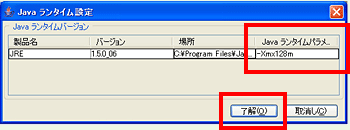 バージョンの欄、「Java ランタイムパラメータ」の 部分に「-Xmx128m」と入力。「了解」ボタンを 押し、設定を変更してください。これで128Mb