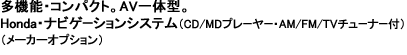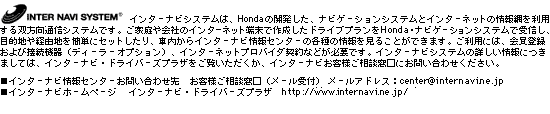 ※1 テレビ 映像は、停車時にサイドブレーキをかけなければご覧になれません。走行中は安全のため音声のみとなります。※2 VICSは、全国主要都市および全国の主要高速道路でサービスされており、順次サービスエリアが拡大されています。VICSの情報を表示するには、ディーラーオプションのVICSレシーバーセットが必要です。詳しくは、販売会社にお問い合わせください。なお、ご利用はHondaオリジナルCD-ROM使用時に限ります。VICSは財団法人道路交通情報通信システムセンターの商標です。●ディスプレイ内側のCDプレーヤーは、音楽ソフト専用です。●ナビゲーションユニットのCD-ROMドライブは、HondaオリジナルCD-ROM専用です。各種ナビ研ソフト、音楽ソフトなどは使用できません。●安全のため、走行中はドライバーが操作しないでください。●ナビゲーションのガイド機能はありますが、実際の走行時は道路交通規制に従い運転してください。●走行中は細街路の表示が制限されます。■画面は実際と多少異なる場合があります。