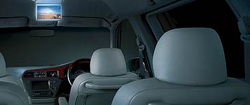| エクスクルーシブには、7インチワイドディスプレイを採用した2列目・3列目シート専用のモニターシステムを装備。TVはもちろんのこと、AV入力端子に接続すれば外出先で撮影したビデオカメラの映像などを、楽しむことができます。ディスプレイは2列目・3列目シートのパッセンジャーから見やすい天井部に設置され、シートのリクライニングに合わせて2段階の角度調節が可能。音声出力は、リアスピーカーON/OFF/フロント音源スルーの3モード切り替え。また、プライベート感覚でモニターシステムを楽しむことができるワイヤレスヘッドホンと音量調節機能付ヘッドホン端子を装備し、それぞれのパッセンジャーが独立した空間を味わうことができます。操作はリモコンで、チャンネル切り替えやボリューム調節などが容易に行えます。 |