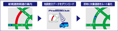 ■新規道路データ配信 新規に開通する主要道路の差分データを配信。その中でも特に利用頻度が高く交通ネットワーク上重要となる道路は、世界初※「リアルタイム地図更新技術」により開通と同時に配信します。 ※道路開通とほぼ同時に地図更新が完了するシステムとしては世界初