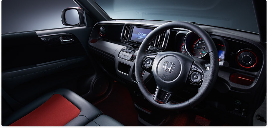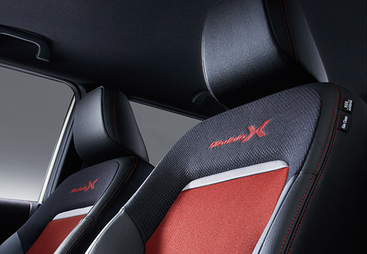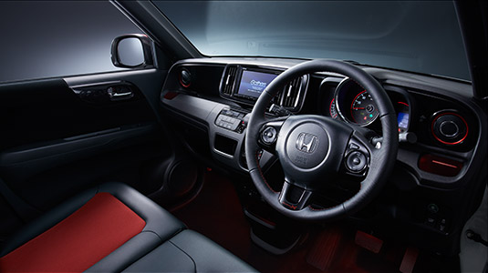 インテリアは、黒で引き締めた空間に鮮やかな赤が引き立つ、スポーティーな仕立てに。ルーフライニングまで黒で統一することで、ドライバーがより運転に集中できる空間を目指した。