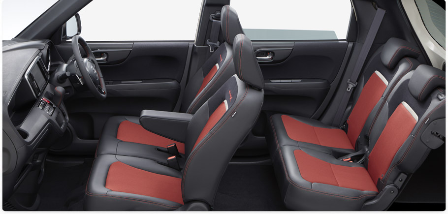 柔らかく質感高いレザー調のプライムスムースとトリコット生地を組み合わせ、座面・背もたれ部分に黒に映える赤を大胆にあしらったコンビシート。