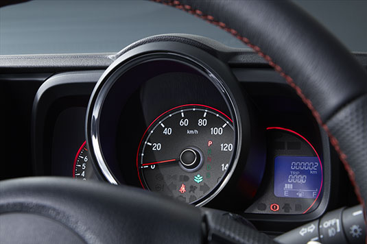 レッド照明の自発光式3眼メーター。深みのある赤がスポーティーさを際立たせる。