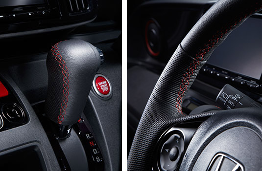 本革巻のステアリングホイールとセレクトレバーは、 パンチングとスムースレザーを組み合わせ、スポーティーに。さらに3本の糸を使って高度な技で縫い上げるユーロステッチで気持ちを昂らせるレッドの縫製を施した。