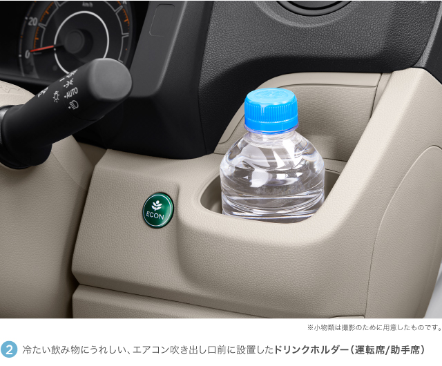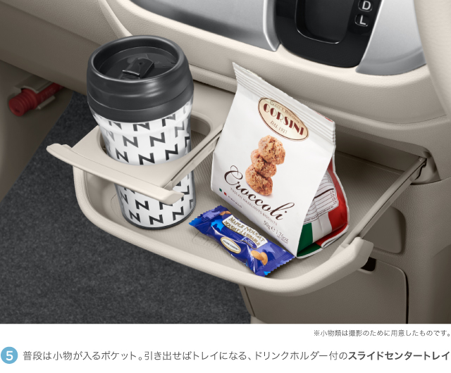 引き出して大きめトレイとして、しまったままでも小物置きとして、運転席からも助手席からも自在に使えるドリンクホルダー付のトレイ。