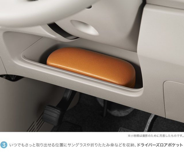 後席の下に燃料タンクがない「センタータンクレイアウト」だからこそできた収納スペース。これまで置き場所に困っていた傘なども、ここにすっきりとしまえます。