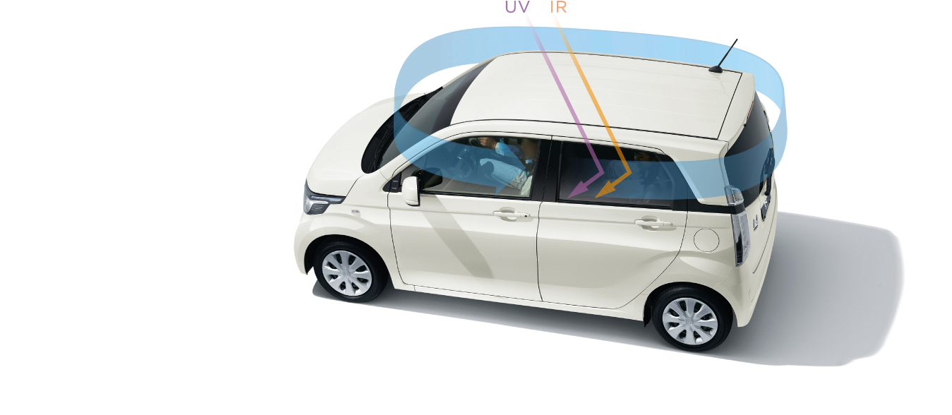 お肌の大敵、紫外線(UV)とジリジリした暑さを生む赤外線(IR)をカットするガラスを、すべての窓に。日差し対策を忘れたときも、安心してドライブできます。