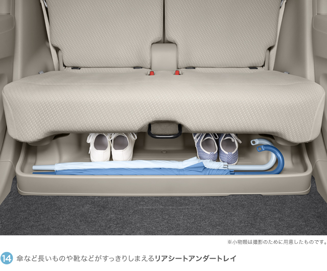 後席の下に燃料タンクがない「センタータンクレイアウト」だからこそできた収納スペース。これまで置き場所に困っていた傘なども、ここにすっきりとしまえます。