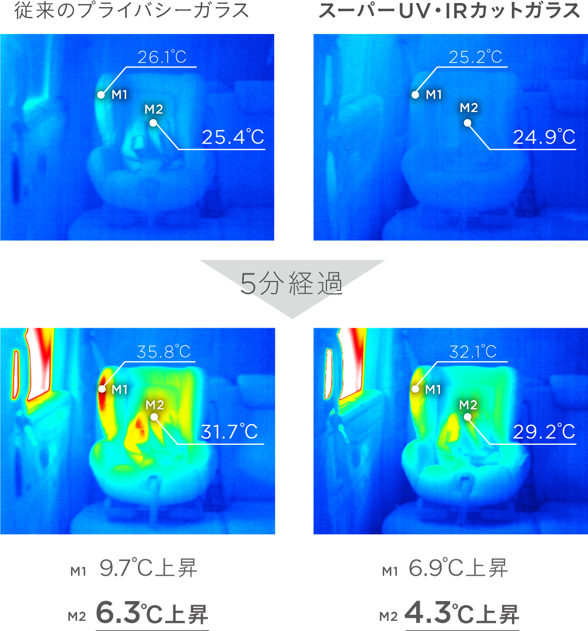 ※3 N-BOXの後席にチャイルドシートを装着し、初夏の強い西日を模した人工太陽灯を5分間照射した際の、従来プライバシーガラスとの比較。