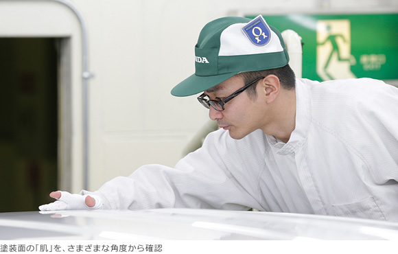 塗装の高技能者が、丹精を込めてルーフを手塗り。細部まで丁寧なマスキングを施し、気温や湿度に応じて主剤・溶剤・硬化剤を調合した塗料で塗装。乾燥を経て、一台一台、まごころを込めて送り出します。