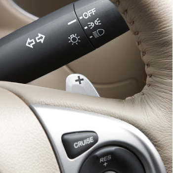 ステアリングの裏側にある「+」と「−」のパドル(レバー)を指先で操作すれば、CVTでありながらマニュアル感覚のシフトチェンジが堪能できるパドルシフト(7スピードモード付)を装備。