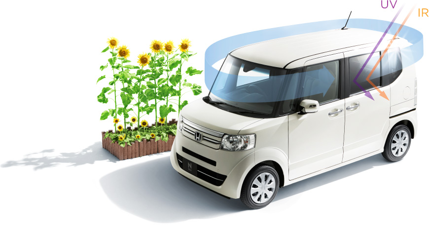 ※3 窓に単板ガラスを採用する仕様として、すべての窓ガラスで紫外線約99%カット(ISO9050基準)と赤外線約70~80%カット(波長域780~2,500nm)を実現。2015年11月現在。Honda調べ。