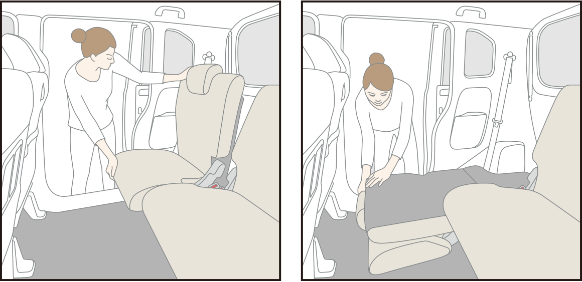 ヘッドレストはそのままに、背もたれを前に倒すワンアクションでシートが足元に収納(ダイブダウン)。車内に広々した空間が出現します。