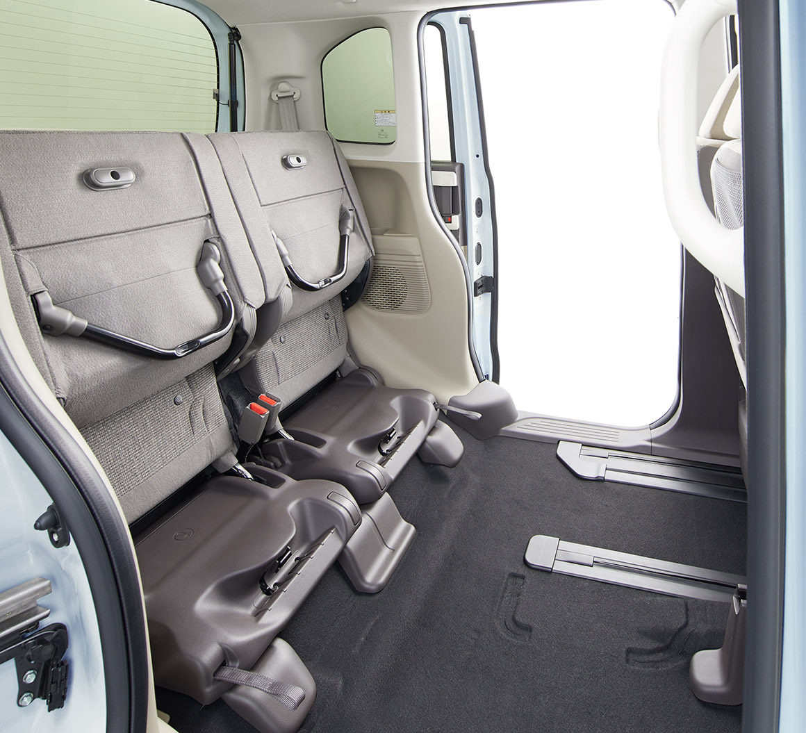 後席を足元に折りたためば、低く広い床面が出現。