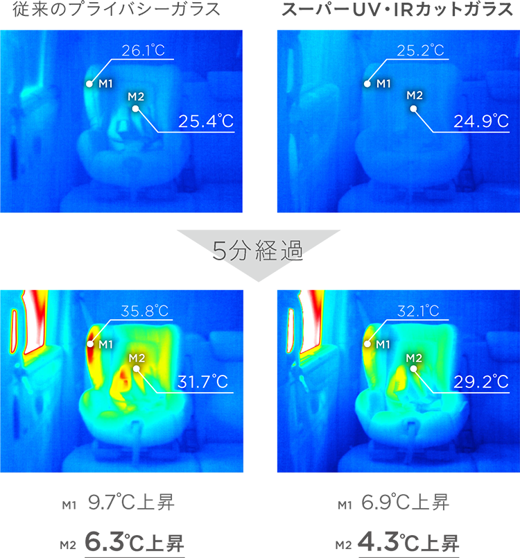 ※9 N-BOX(2016年モデル)の後席にチャイルドシートを装着し、初夏の強い西日を模した人工太陽灯を5分間照射した際の、従来プライバシーガラスとの比較。