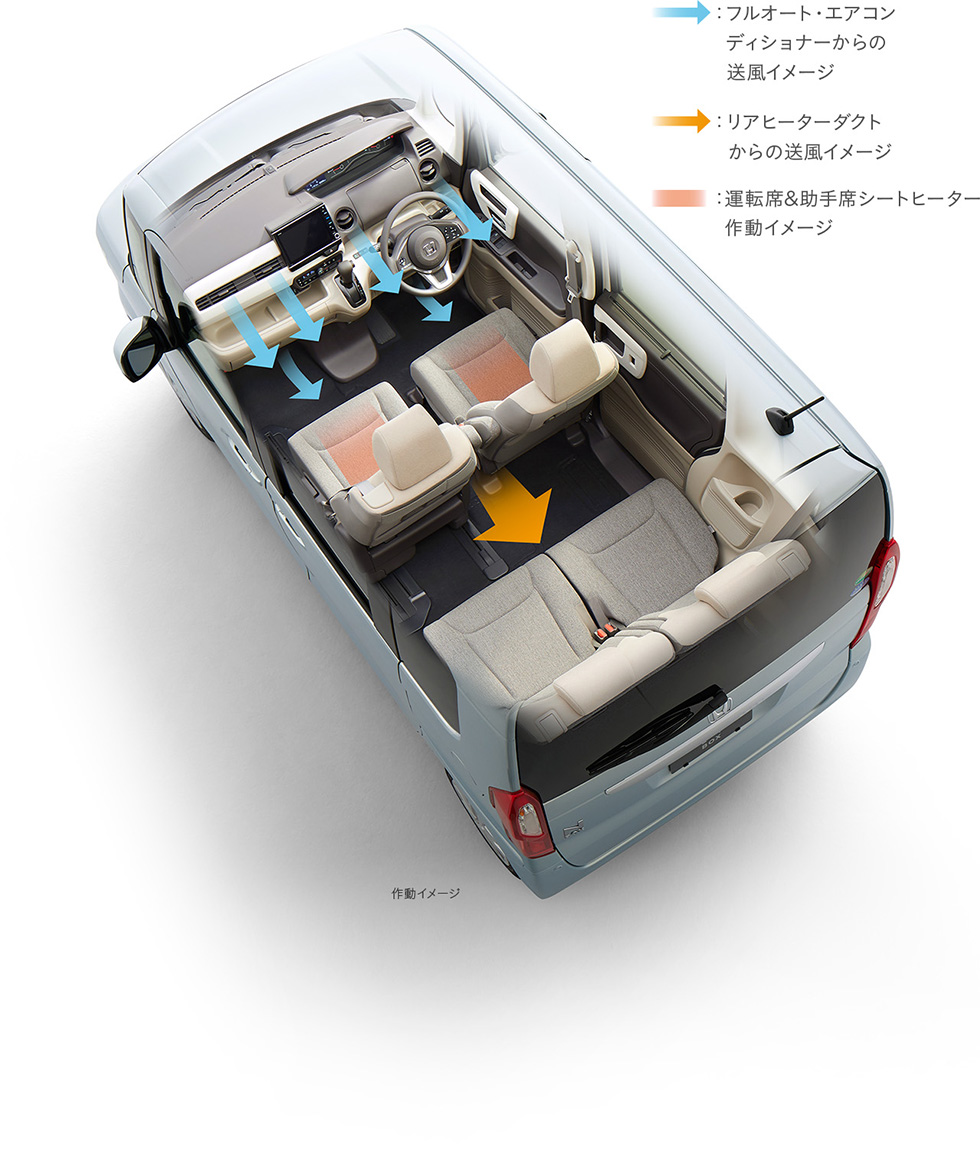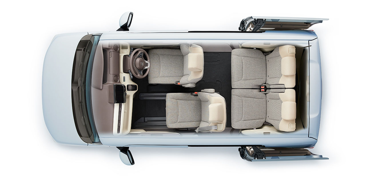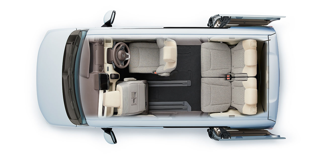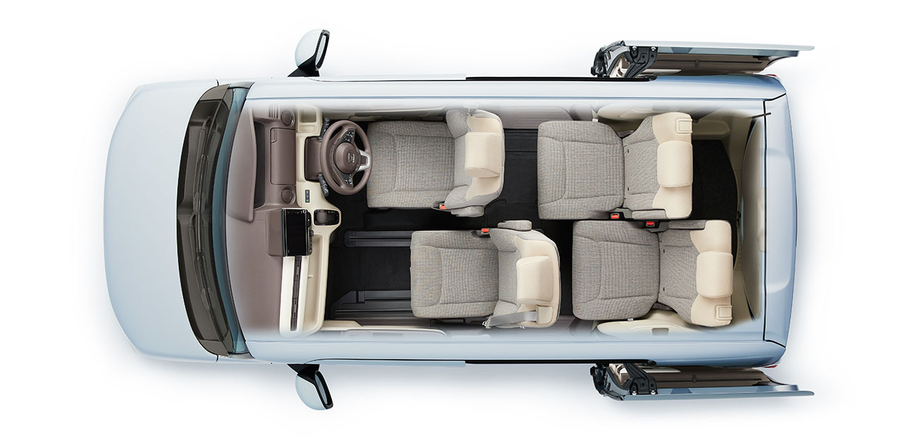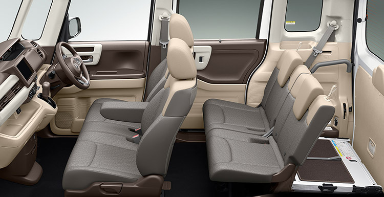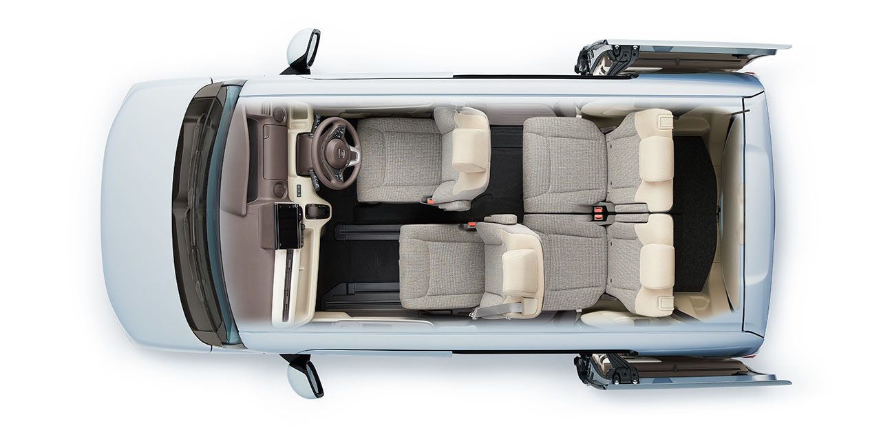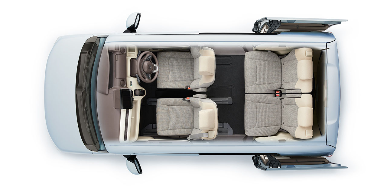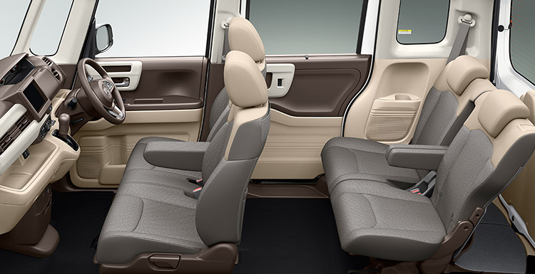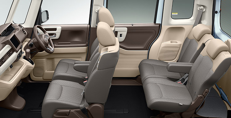 プラットフォームから新開発することで、N-BOXの室内空間がさらに拡大。大人4人が乗ってもしっかりとくつろげる、ゆとりの空間を実現しています。
