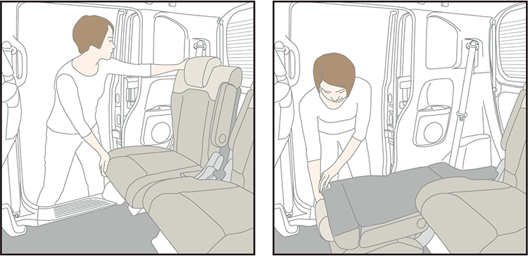 ヘッドレストはそのままに、背もたれを前に倒すワンアクションでシートが足元に収納(ダイブダウン)。車内に広々した空間が出現します。