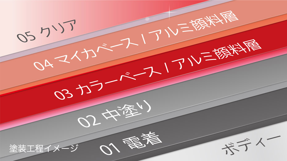 鮮やかな赤の彩度の高さと、光が当たった時の陰影感を両立する、ダイナミックなメタリックカラー。