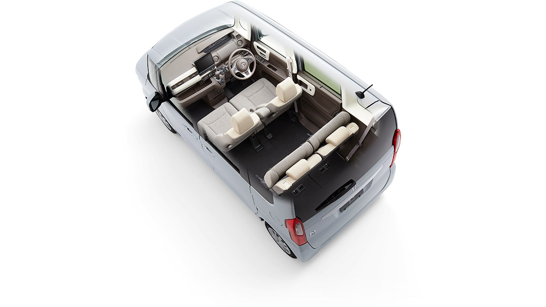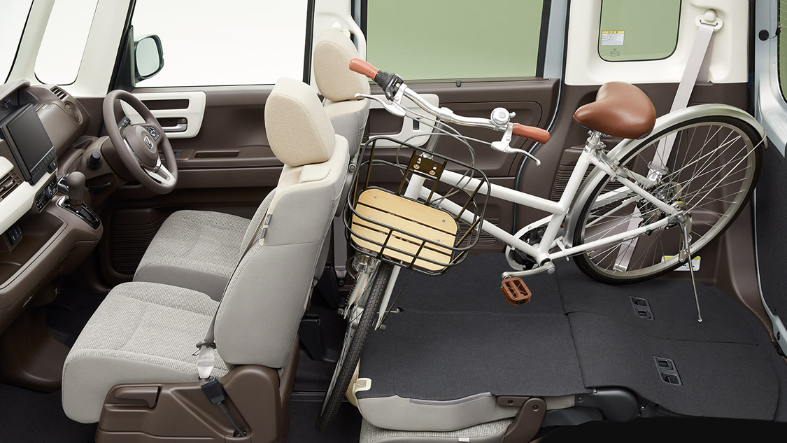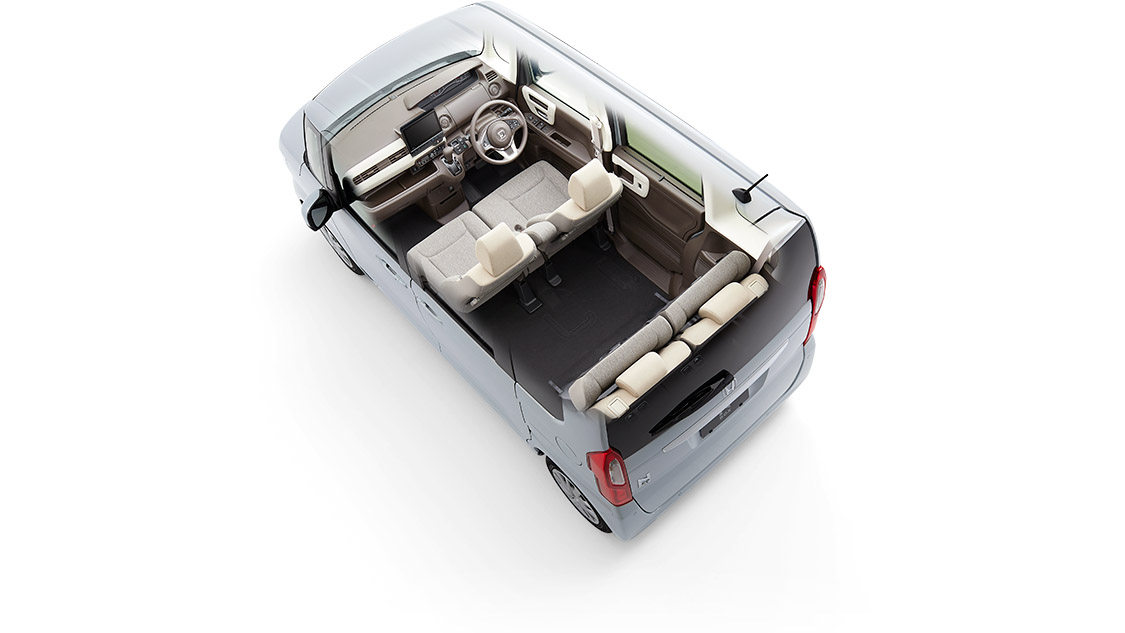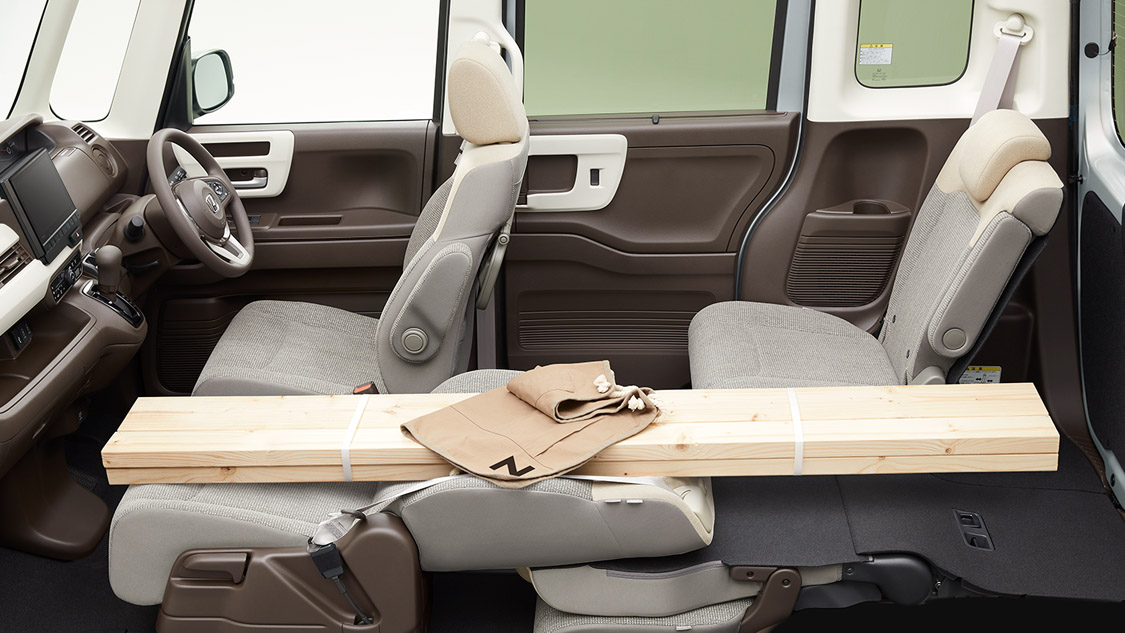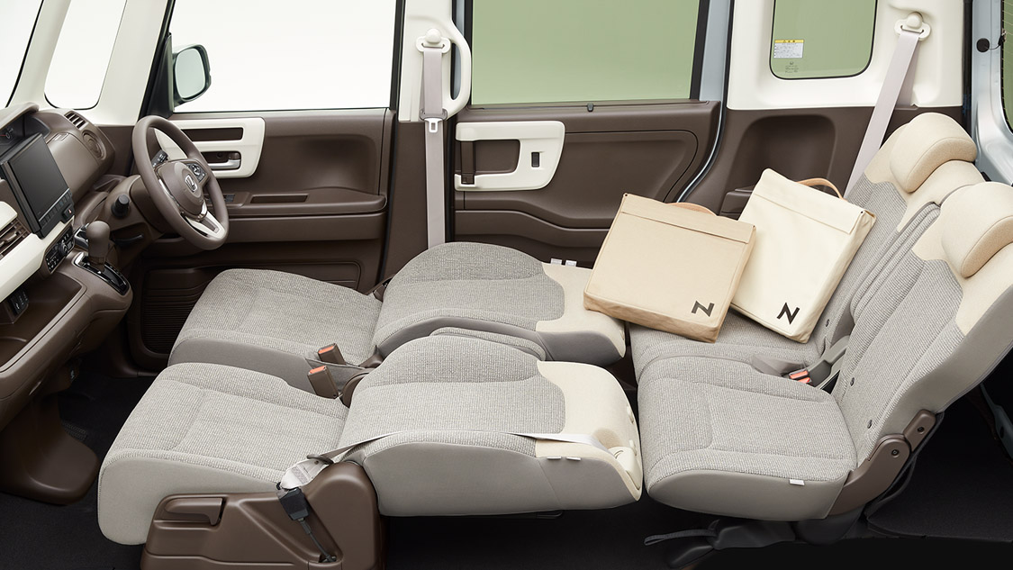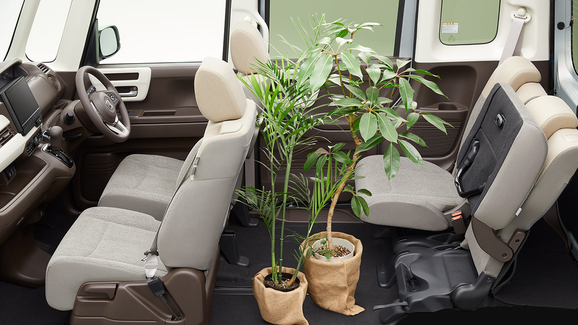 前席にフロントベンチシート、後席にチップアップ&ダイブダウン機構付スライドリアシートを装備。N-BOXの広さを活かした多彩なシートアレンジが可能です。