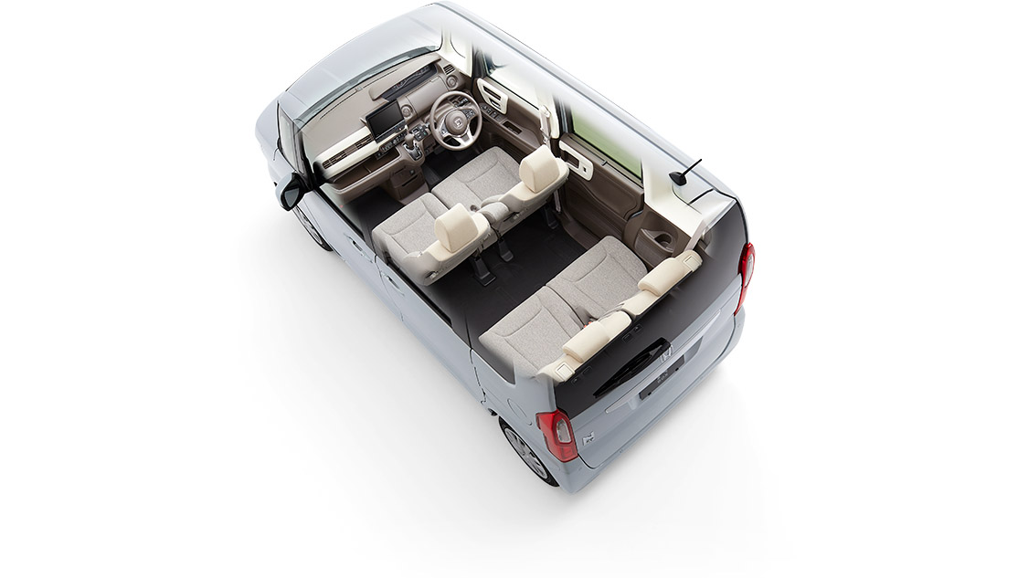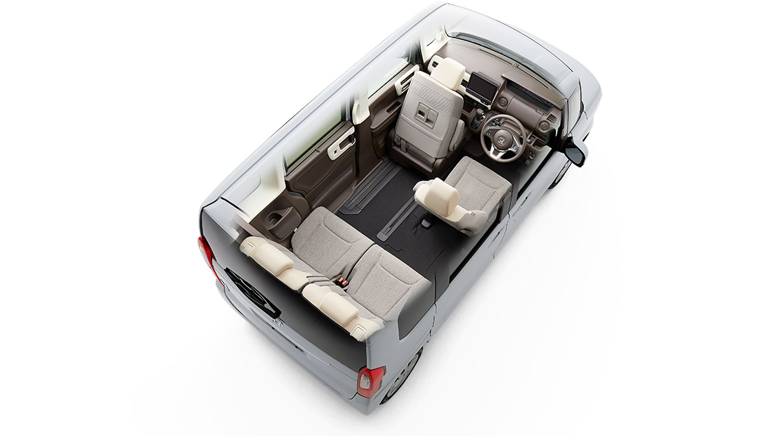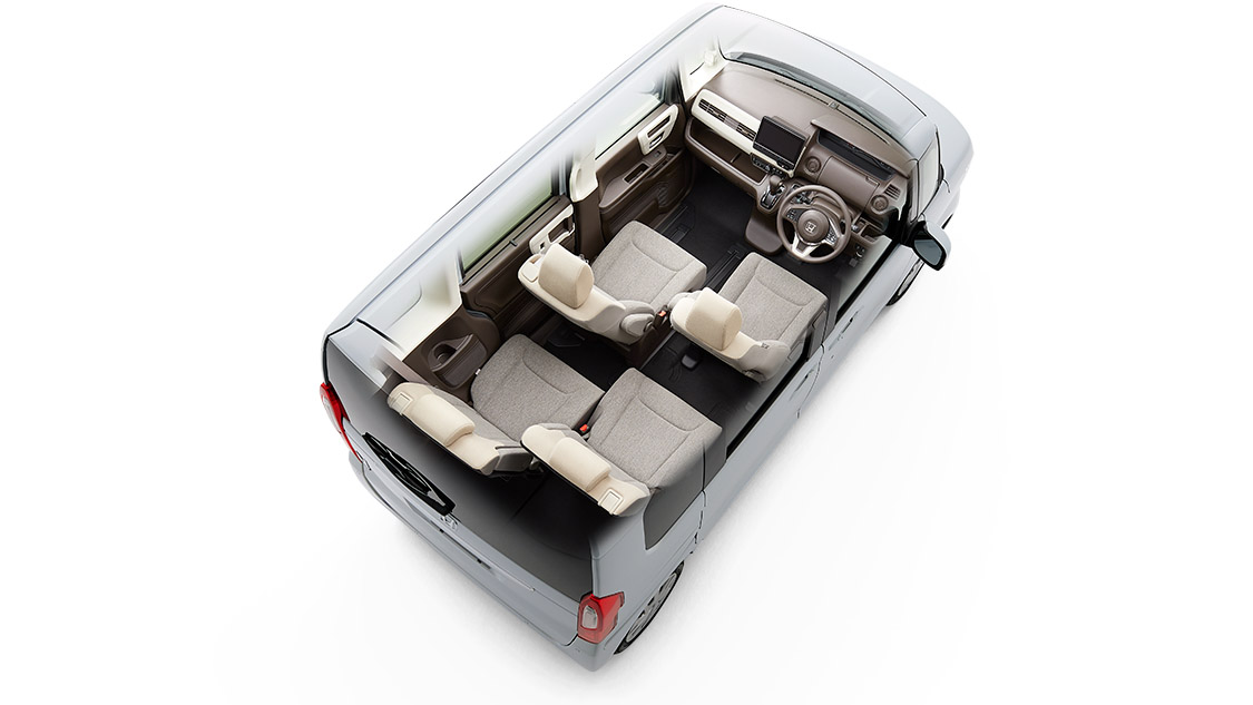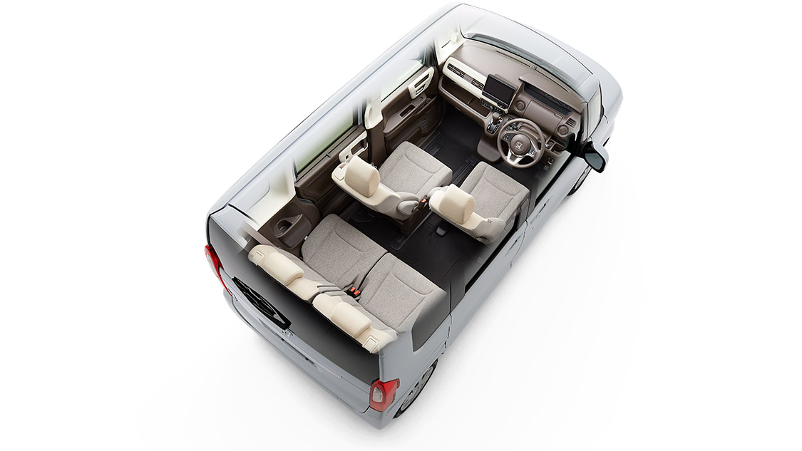 プラットフォームから新開発することで、N-BOXの室内空間がさらに拡大。大人4人が乗ってもしっかりとくつろげる、ゆとりの空間を実現しています。