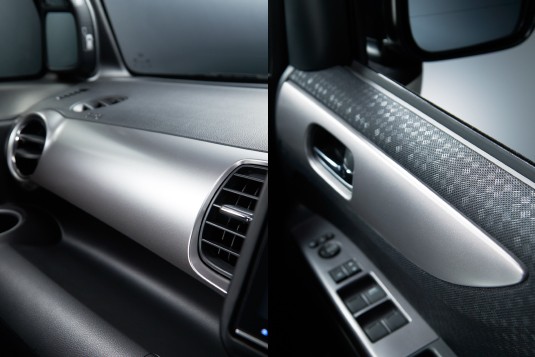 インパネを横一文字に貫くガーニッシュと、それと連続するイメージでフロント/リアドアに配したガーニッシュ。そのどちらにも輝度を抑えた金属調の塗装を施し、空間の上質なアクセントとした。
