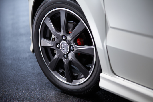 ブラックパール色塗装のスポークと切削仕上げのリム。明暗の対比で、足元を力強く大きく見せるデザインの専用15インチアルミホイール。また、ブレーキディスクローターは専用に赤く塗装。鈴鹿製作所での組み付け時、特別に梱包してラインサイドへ慎重に搬送するなど、生産工程においてもModulo Xならではの工夫を凝らしている。