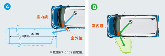 後方視角支援ミラーの映し出す範囲は限られていますので、必ず目視で車両周辺の安全を確認してください。