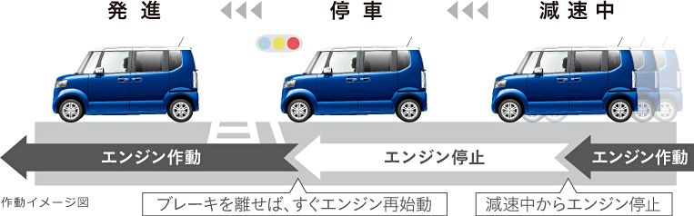 赤信号の手前など、減速中からエンジンを自動的にストップ。