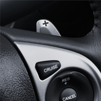 ステアリングの裏側にある「+」と「−」のパドル(レバー)を指先で操作すれば、CVTでありながらマニュアル感覚のシフトチェンジが堪能できるパドルシフト(7スピードモード付)を装備。