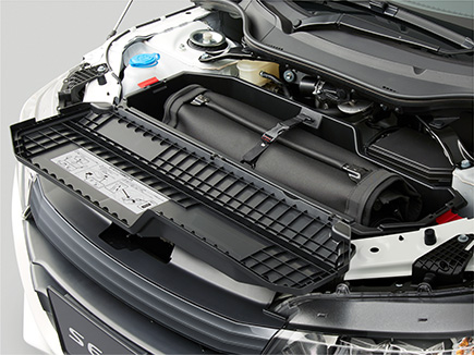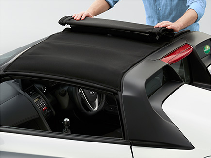 ルーフ前方(フロントウインドウ側)の中央部に設けたセンターロックと、ルーフサイド(ドア側)左右のサイドロックにより、装着時には強いテンションがかかる構造で高い密閉性を確保。取り外しも簡単で、各ロックを解除して巻き取り、フロントフード内のユーティリティボックスに収納できる。