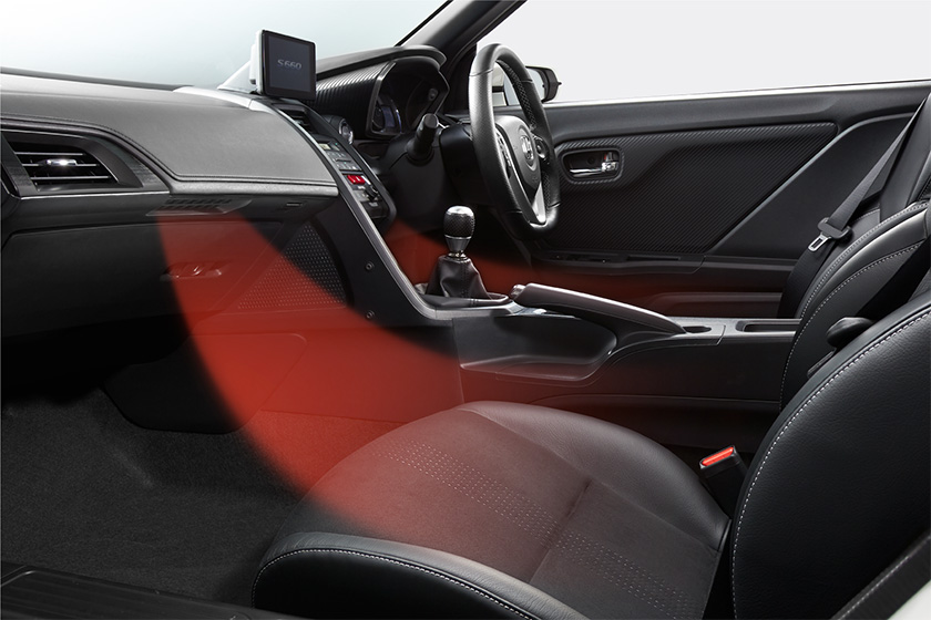 ヒップポイントを極めて低くし、さらにヒップポイントからペダルまでの間隔を長くとり、ペダルを前方に設定することで"ペダルを前に踏み込む"姿勢に。低い視線で、より車速を体感しやすく、クルマの挙動をダイレクトに感じ取れるゴーカート感覚を追求した。