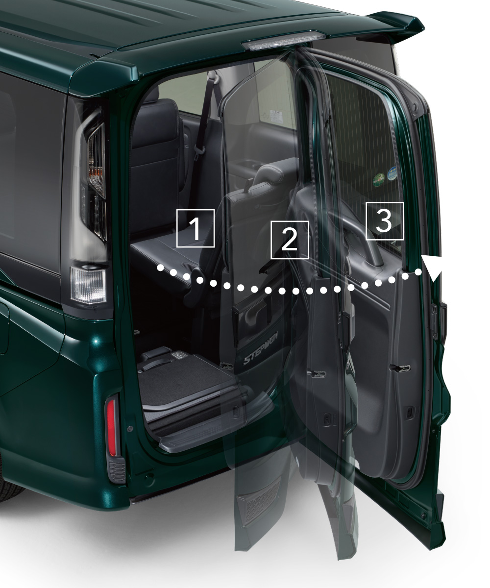 クルマの後ろにスペースがない場合でも、後ろのドアをヨコに開ければ荷物の積みおろしもラクラク。3列目シートから乗り降りする時にも便利。