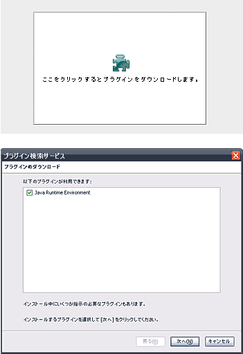 何らかの理由により、[Java仮想マシン]がインストールされていない場合、自動的に[Java仮想マシン]のインストールを促すダイアログが表示されますので指示に従ってインストールを終了してください。このセットアップには通信環境によっては多少時間がかかる場合があります。
