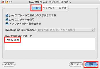 (3)[ java(TM)Plug-inコントロールパネル ]が開きます。タグの[ 一般 ]を選択。[ java実行時のパラメータ ]の欄に[ -Xmx128m ]と記入。[ 適用 ]ボタンを押す。これでjavaのメモリー上限が256MBになりました。