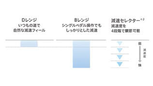 - 減速セレクターで選択した減速度は、一定条件のもとで自動で解除。Bレンジ、SPORTモードでの走行中は固定となります。