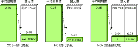 Z諸元値と、国内自動車排出ガス平均規制値(平成10年規制)との比較(10・15モード時)単位:g/km |