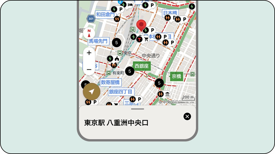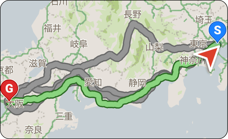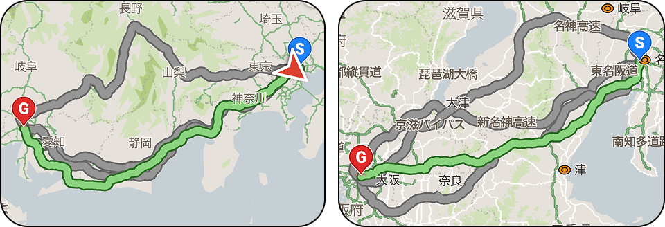 今回は「EVカーナビ by NAVITIME」の充電スタンド検索で東京駅ー名古屋駅、名古屋駅ー大阪駅間(それぞれ一般道の走行ルート)で充電できる場所をカウントしてみました※1!