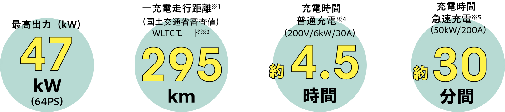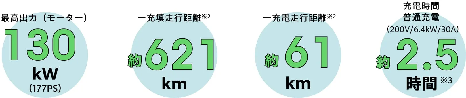 ※1 一充電走行距離は定められた試験条件での値です。お客様の使用環境(気象、渋滞等)や運転方法(急発進、エアコン使用等)に応じて一充電走行距離は大きく異なります。とくに1日当たりの走行距離、バッテリーの充電状態、エアコン使用による影響を大きく受けます。