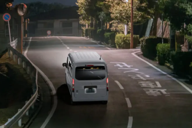 夜の配達も心配ないですね。頼もしい走りなのに、EVだから車外に聞こえる音はとっても静か。周りに配慮できる気の利くクルマです。