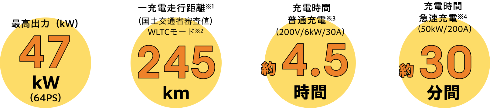 ※4 急速充電器の出力が50kWの場合。急速充電は、充電残量警告灯が点灯した時点から、充電量80%までのおおよその時間(特に、夏季・冬季には充電時間が長くなる場合があります)。